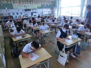 「丸付けボランティア」も今月から再開し、18名の保護者・地域の方々に来て頂きました。子どもたちも、「やったらすぐに丸を付けてもらえるから」と、毎回、楽しみにしています。ありがとうございます。(写真は、4・5年生の様子です)