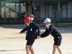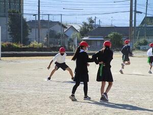 6年生は、「みんなで楽しく過ごすために」という勉強をしています。1年生にも遊び方が分かるようにするためにはどう説明するか? 説明を聞いた後、自分たちで遊びながら確かめています。6年生でも、遊んでいる時の顔は、1年生と変わらないくらい楽しそうです。