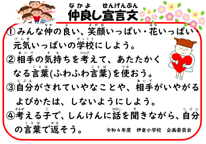 「なかよし宣言文」は、みんなが安心して過ごせるよりよい学校にするために、子どもたちの話し合いによって毎年見直しを行いながら、伊倉小学校でずっと大切に受け継いでいる宣言文です。