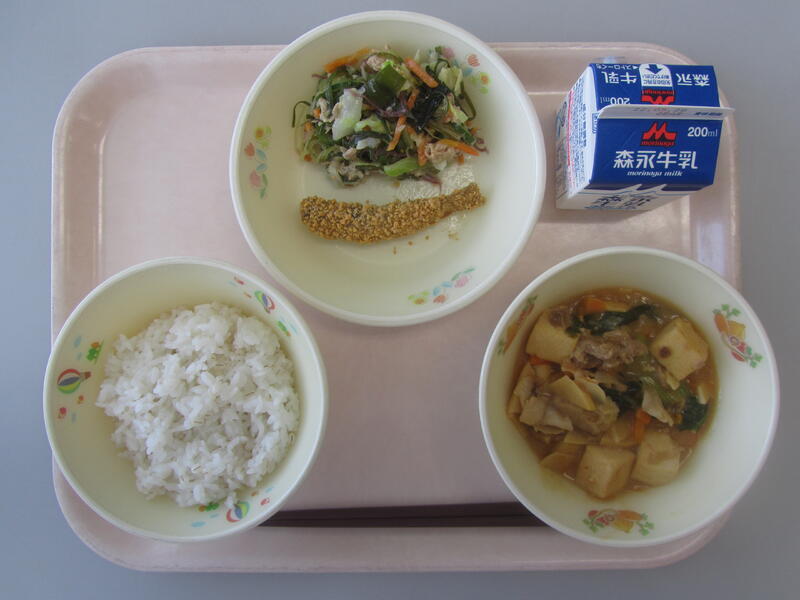 5月17日(火)の給食(麦ごはん 牛乳 家常豆腐 いわしのカリカリあげ 海藻サラダ)