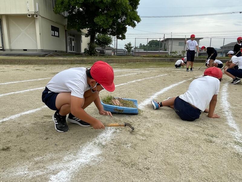 体育委員や6年生を中心に、進んでグラウンドに出て草取りや石拾いをしてくれています。