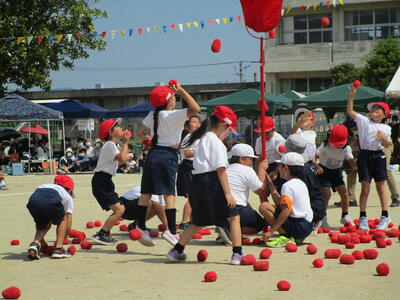 ↑みんなで協力して玉入れ!赤も白も譲らない勝負でした。