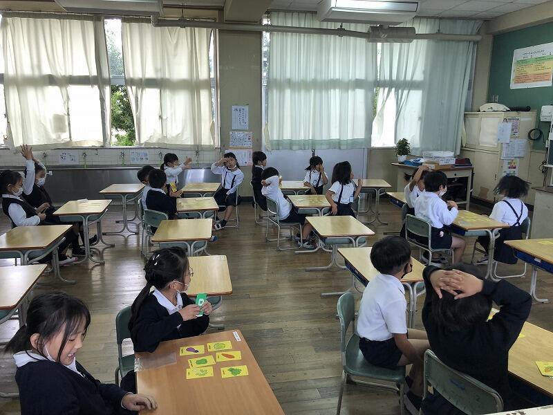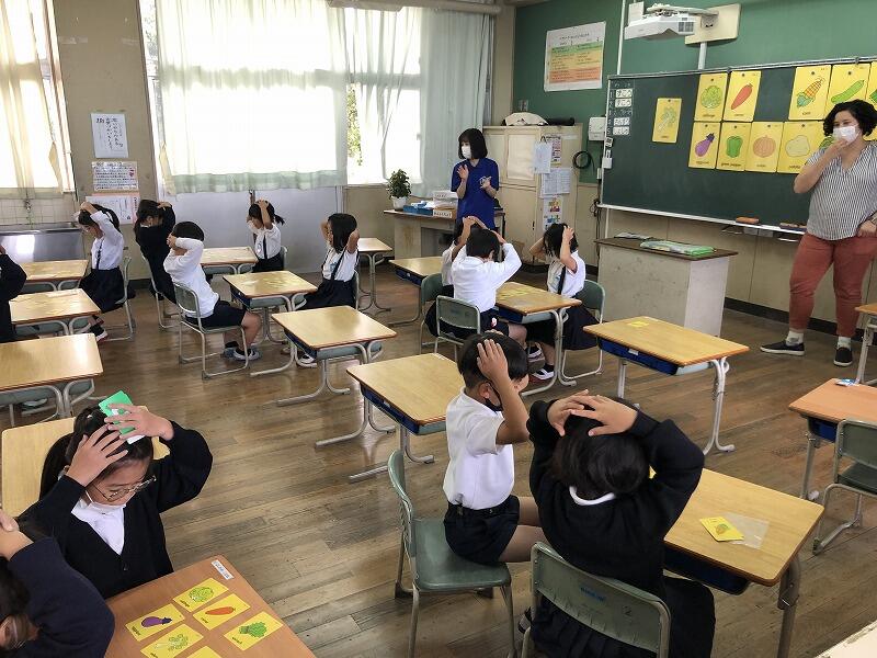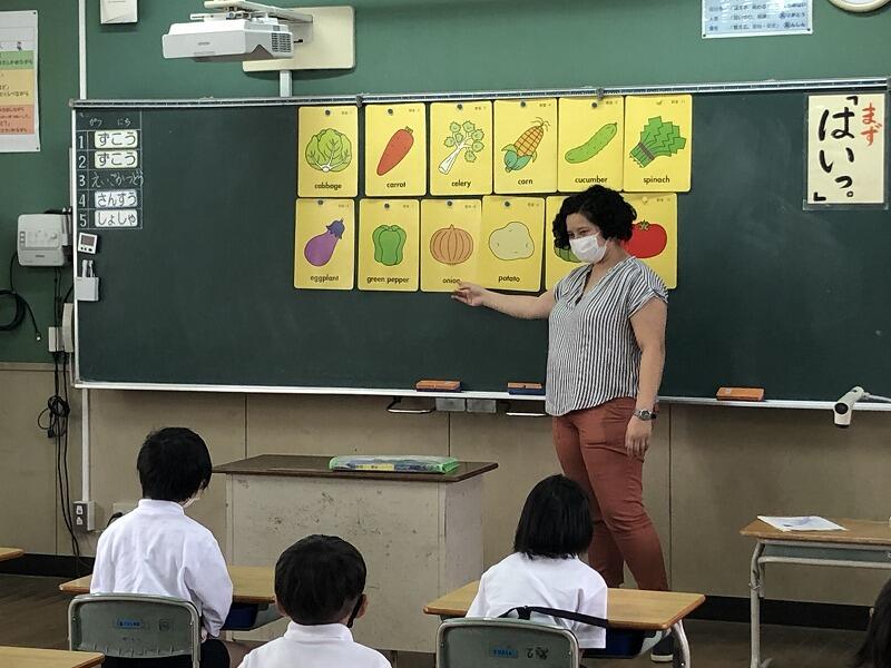 シェイ先生の発音をよく聞いて、身近な野菜を英語で言えるように、何度もビッグボイスで練習していました。とても楽しく活動できました。