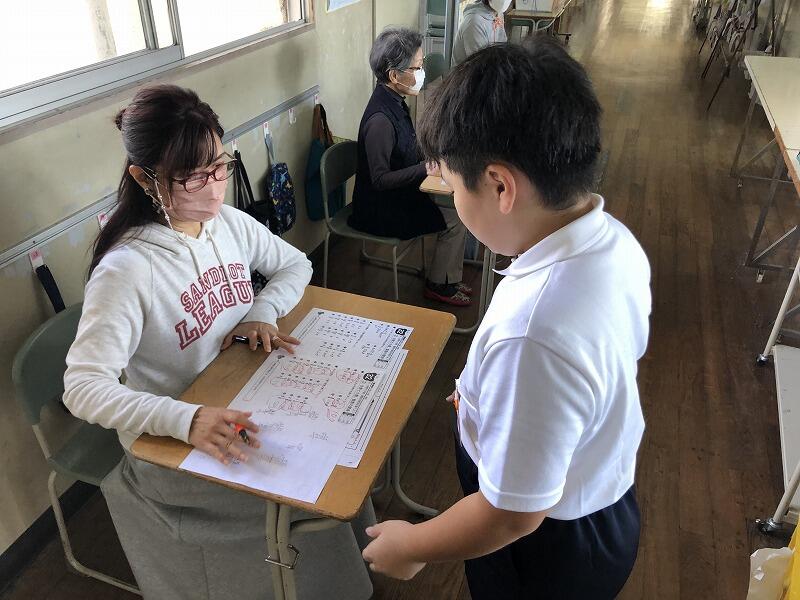 今日の朝活働の時間に、算数の基礎・基本問題に取り組みました。プリントが1枚仕上がると丸付けボランティアさんに丸付けをしていただきます。