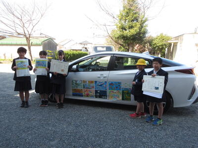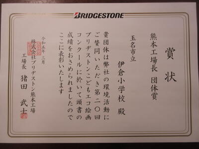 本校が第20回ブリヂストンこどもエコ絵画コンクール(環境活動の一環)にて熊本工場長団体賞を受賞しました。個人としても6人の児童が受賞しました。この日は工場長さんらが来校され表彰を行ってくださいました。写真は表彰状と受章者自らの絵がラッピングされたクルマの前で記念撮影した様子です。
