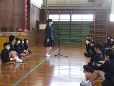 後期を振り返っての発表では、それぞれの学年に応じた充実の半年間の様子や次の学年や将来への意欲あふれる目標が述べられました。原稿を読むことなく発表できた児童もいました。
