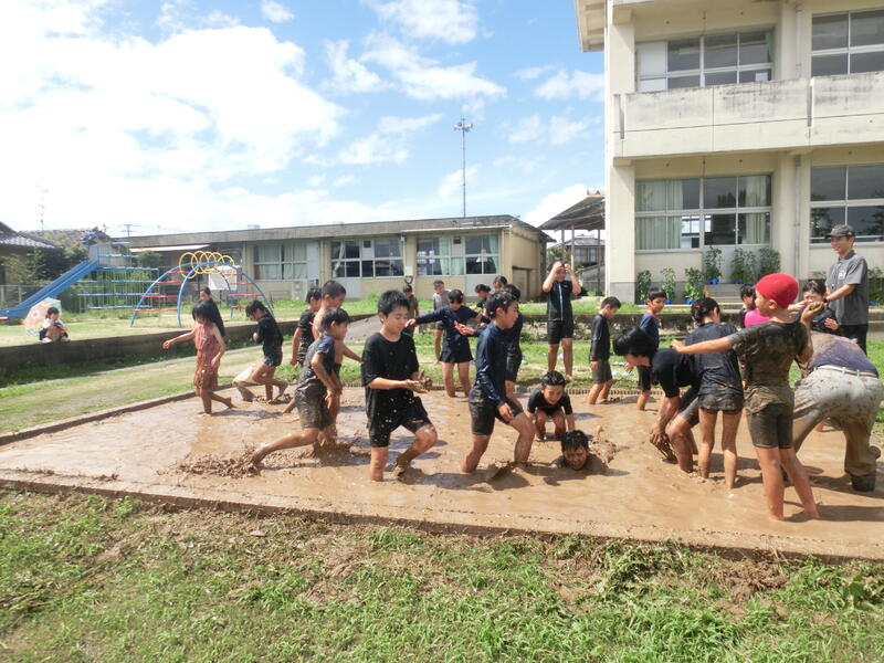 7月2日(火)の6校時にPTA役員の田上さん夫婦と田河さんのご指導のもと「しろかき」を行いました。