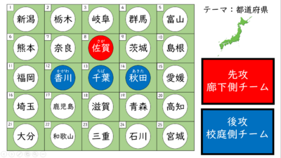東大生たちの頭脳戦が見られる某番組をオマージュした教材です。漢字を読めたら自分のチームの色が置けるオセロを作りました。1回クリックすると赤色に変わり、もう1回クリックすると青色に変わります。都道府県の漢字を例として入れていますが、編集次第では全学年に活用できます。楽しみながら漢字の読みを覚えていきましょう。