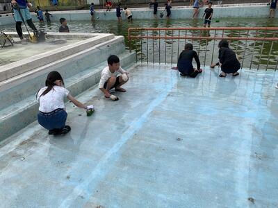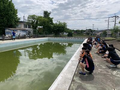 本日の2,3校時に高学年みんなでプール掃除をしました。底の見えない一面緑の水面、あちらこちらに現れる生物たち、しつこい汚れなどを相手に2時間みっちり掃除してくれた5,6年生に感謝です。