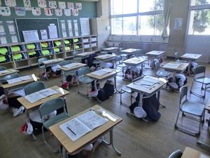 算数の授業中だった1年生も、担任の先生の指示に従って、静かに机の下に避難していました。1年生は、ほぼ全員の4月に行った避難訓練の成果が見られました。ご家庭などで、被害等はありませんでしたでしょうか?