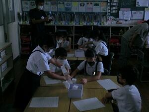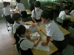 4年生は、「垂直と平行」の勉強が日頃の生活の中にどう生かされているのか?の学習でした。家を建てるときには、柱と柱の間に筋交いを入れますが、全部に必要なのだろうか?ということを、ビルの形にした紙に、空き箱を入れながら耐震構造を考えました。授業を終えた子どもたちの感想には、「筋交いは全部に入れなくても、垂直と平行を使うと、少なくてすむ。ということが分かったので、楽しかったです。楽しい授業をありがとうございました。」とありました。聞いていた先生たちも、「なるほど~」という内容でした。