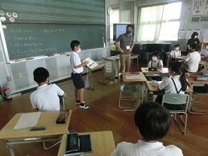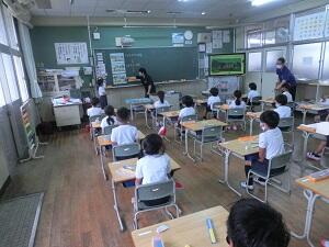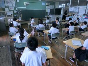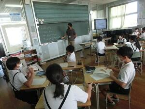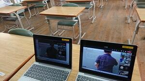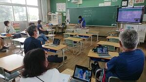 そのような中、授業を配信する先生たちも、初めての経験でどうしたらいいのか分からない状況です。そこで、担当先生が中心になって、どのように授業を進めたらいいのかを研修しました。その後、それぞれの教室に移動して、全員の先生に短い授業をしてもらいましたが、黒板の文字が小さかったり、子ども役の先生がタブレット操作を間違えて授業が中断したりと、授業をする方も受ける方(子ども)も慣れるまでは大変なようです。