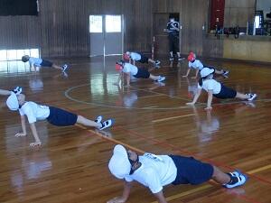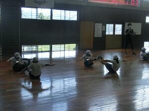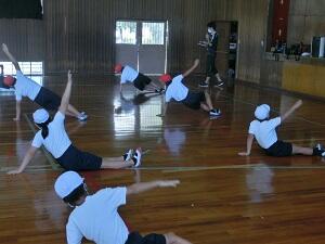 5年生は、東京オリンピック開会式でも使われた「ドラゴンクエスト」の曲にのって、組体操の練習をしています。コロナ禍で運動不足気味の子どもたちも、曲に合わせてがんばっています。一人技から二人技の練習に進んでいます。