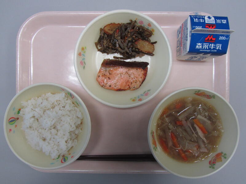 11月10日(水)の給食 麦ごはん 牛乳 沢煮椀 鮭の香草焼き 茎わかめのきんぴら