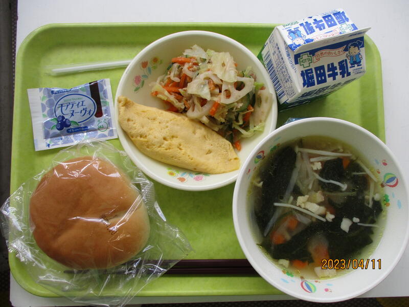 今日の献立は、丸パン、ブルーベリージャム、ミートオムレツ、れんこんサラダ、コンソメスープでした。サラダのれんこんは熊本県産のものを使っています。オムレツの中にはミートソースがたっぷり入っていて、子どもたちにも大人気でした。コンソメスープは、野菜のうまみが出るように、玉ねぎをしっかり炒めました。明日からは、小一、中一の皆さんも加わって、今津小、松島中、合計384人でいただきます。