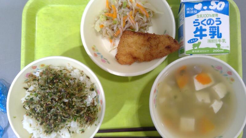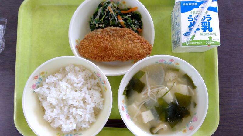 今日の献立は、麦ご飯、さけフライ、ほうれん草のごま和え、とうふのみそ汁でした。さけのフライは大きくてボリュームがありましたが、1年生の子どもたちもぱくぱくと食べて完食しました。