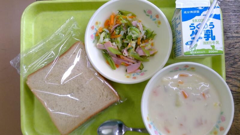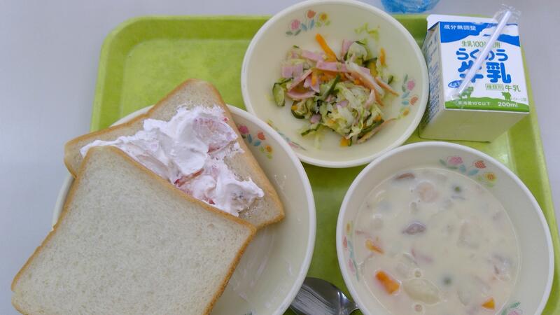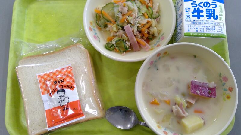 今日の献立は、食パン、クリームゴールド、さつまいもポタージュ、ツナサラダでした。今月は秋が旬の食材をたっぷり使っていきたいと思います。トップバッターは「さつまいも」でした。ポタージュには、生とペーストの2種のさつまいもをたっぷり使い、スープ全体が甘みのあるほっこりしたポタージュになりました。1,2年生ともにもりもりと食べてくれました。