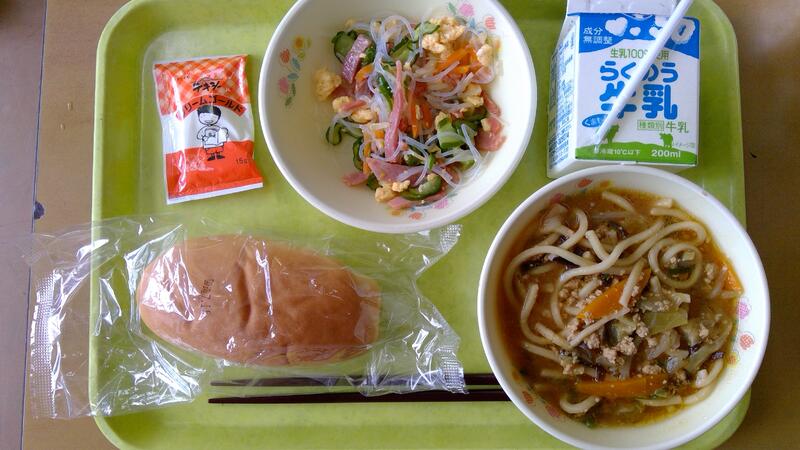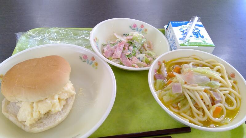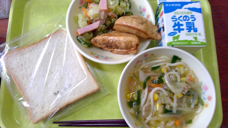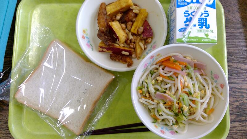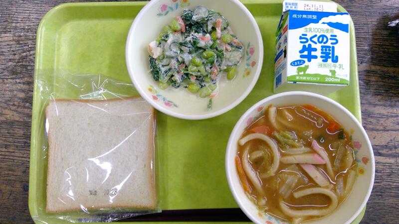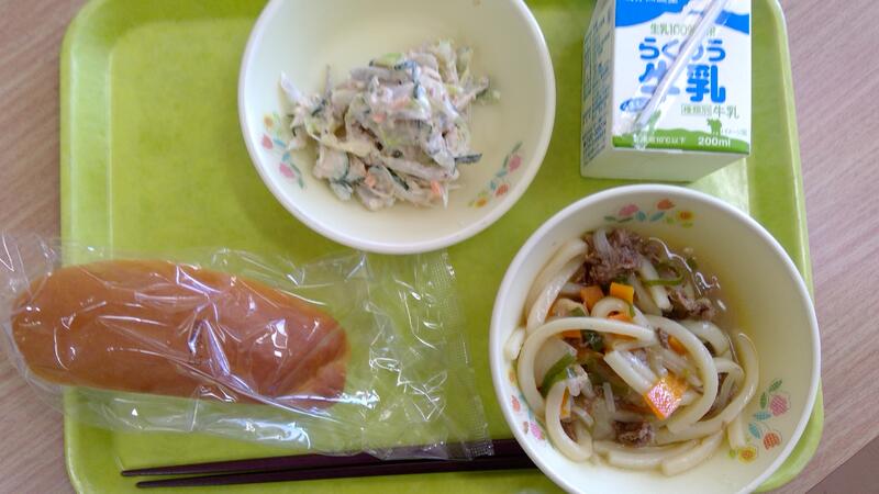 今日の献立は、ミルクパン、ミックスうどん、ごぼうサラダでした。ミックスうどんは、肉ときつね(あげ)が両方入っているうどんです。4年生のお友だちが、「とてもおいしかったです。」と丁寧に感想を言ってくれました。