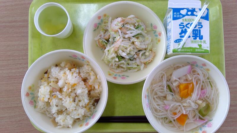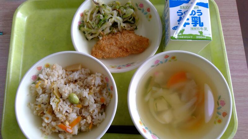 今日の献立は、竹の子鶏釜飯、しいらフライ、ゆずあえ、すまし汁でした。8種の旬の竹の子をはじめ具材が入った釜飯は、子どもたちもぱくぱくと食べてくれました。天草産しいらのフライは身がしっとりして柔らかく、「おいしい」という声がたくさん聞かれました。