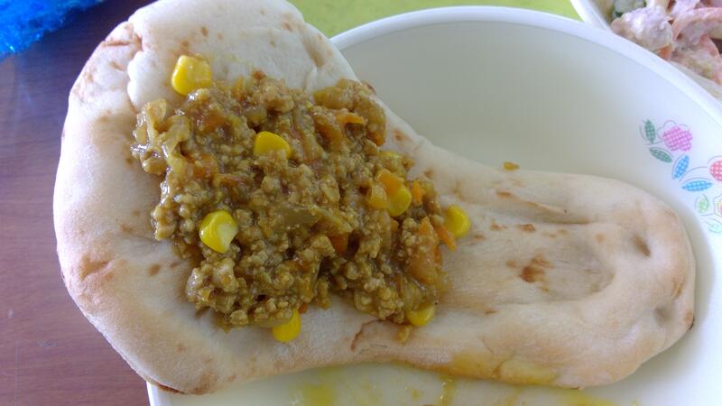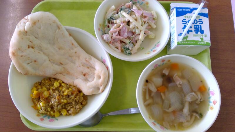 今日の献立は、ナンカレー、ポテトスープ、マカロニサラダでした。校長先生から「学校でナンカレーが食べられるなんて!」と言っていただきました。子どもたちもとても喜んでくれて、増量希望の人がたくさんいました。楽しそうにナンの上にカレーそぼろをトッピングして食べてくれました。