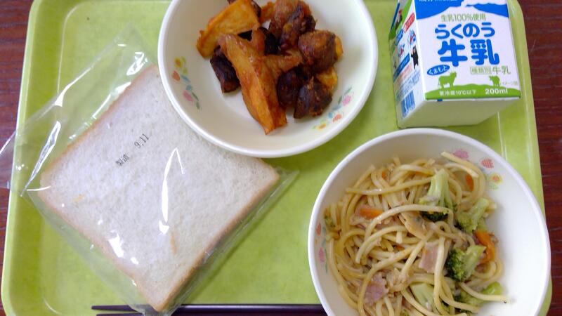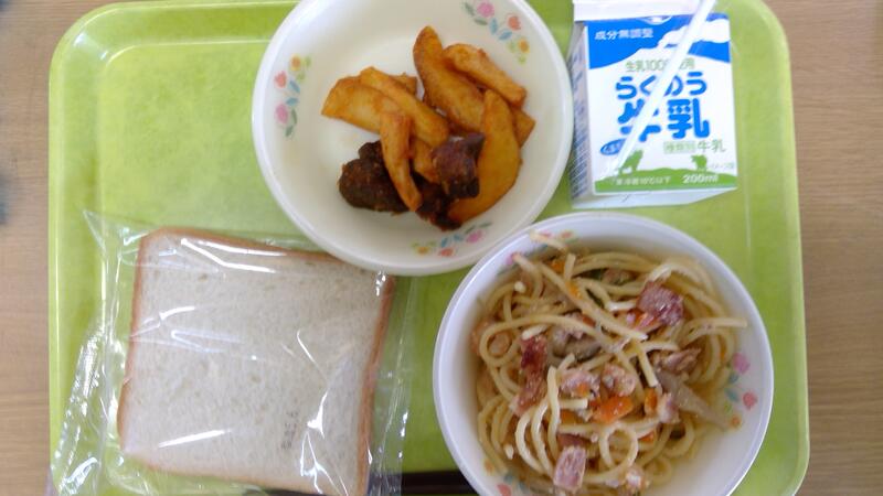 今日の献立は、食パン、ちりめんパスタ、ポテトとレバーのケチャップ煮でした。5,6年生は27日の陸上記録会に向けての練習が始まりました。今日は、5,6年生教室でレバーに含まれる鉄分の効果についてお話しし、持久力アップと疲れにくい体をつくるために、しっかり食べることを約束しました。揚げたポテトとレバーをあえたたれは、にんにくとしょうがをきかせたケチャップソースで、レバーが苦手な子どもたちも「これなら食べられます。」とおかわりの希望者も多数でした。鉄分は意識してとらないと、家庭での食事でも不足しがちです。おうちでもどうぞお試し下さい。