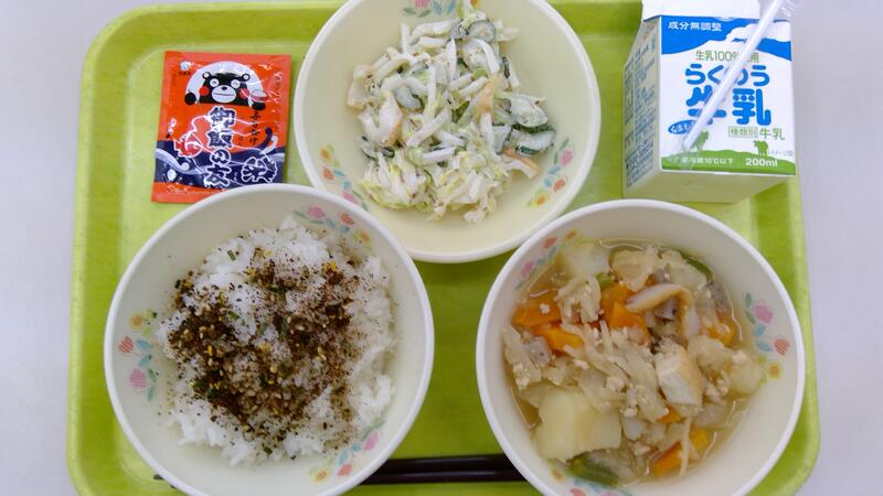 今日の献立は、コロッケ丼、和風サラダでした。コロッケは熊本県学校給食会の2学期のおすすめ商品「肉じゃがコロッケ」です。5年生のお友だちが「今日のコロッケは〇〇〇(某デパート)に売ってあるものと同じ味がしておいしかったです。」と感想を言ってくれました。