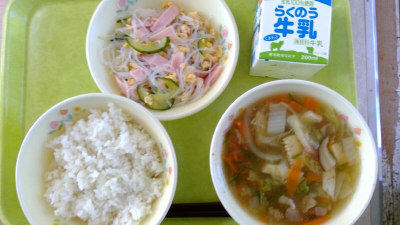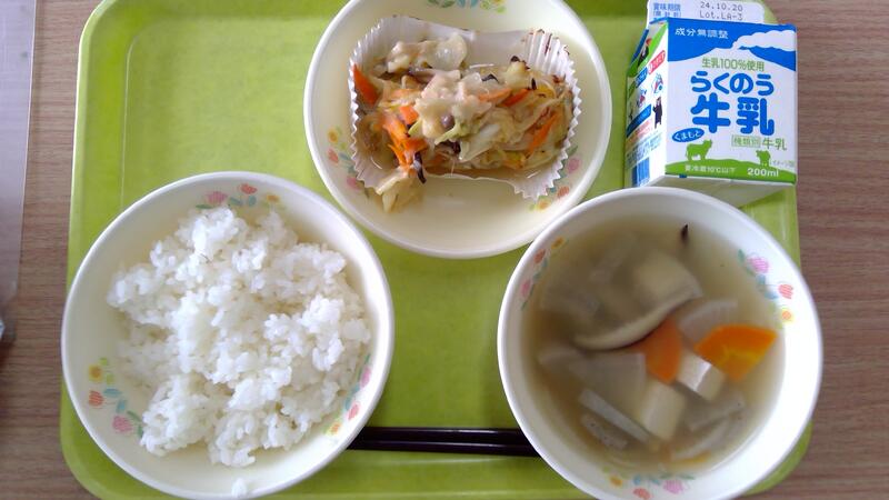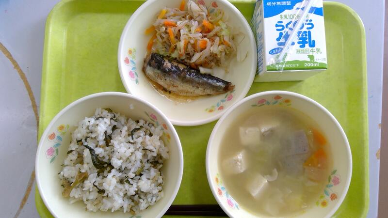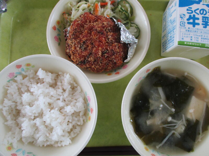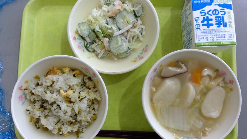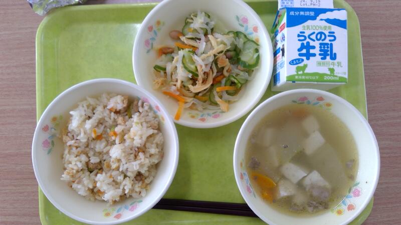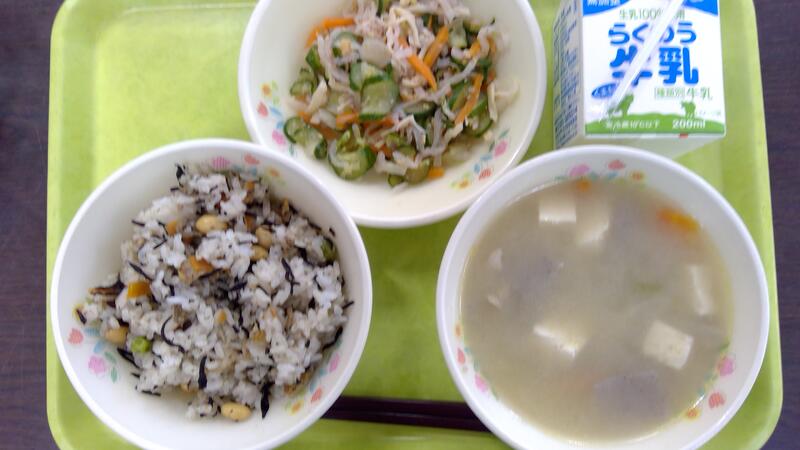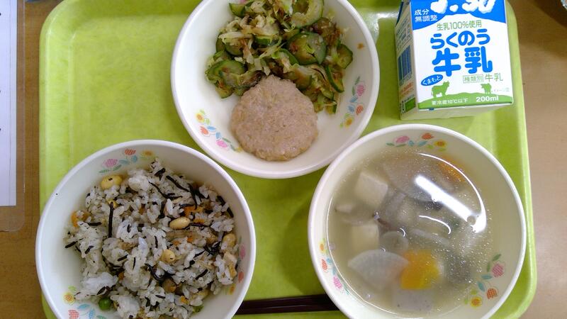 今日の献立は、ひじきごはん、キャベツのつくね煮、おかかあえ、けんちん汁でした。ひじきごはんは1年生の子どもたちもたくさんの人がおかわりをしてくれました。運動会の練習も追い込みです。しっかり鉄分を取って、元気に当日を迎えられそうですね。