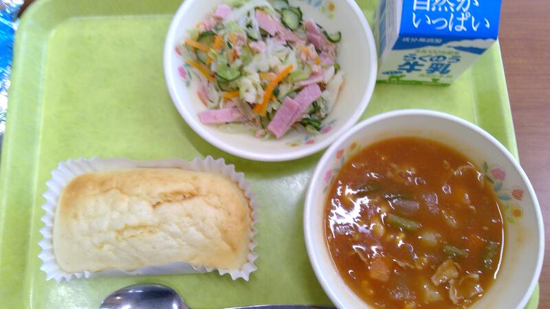 今日の献立は、あげパン、クラムチャウダー、ひじきマヨサラダでした。今日はすべての献立に、貧血予防の鉄分が含まれる食材が入っています。パン→きなこ、スープ→あさり、サラダ→ひじき、です。鉄分をしっかり取って、疲れ知らずの体を作ってほしいですね!