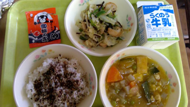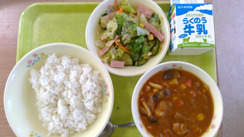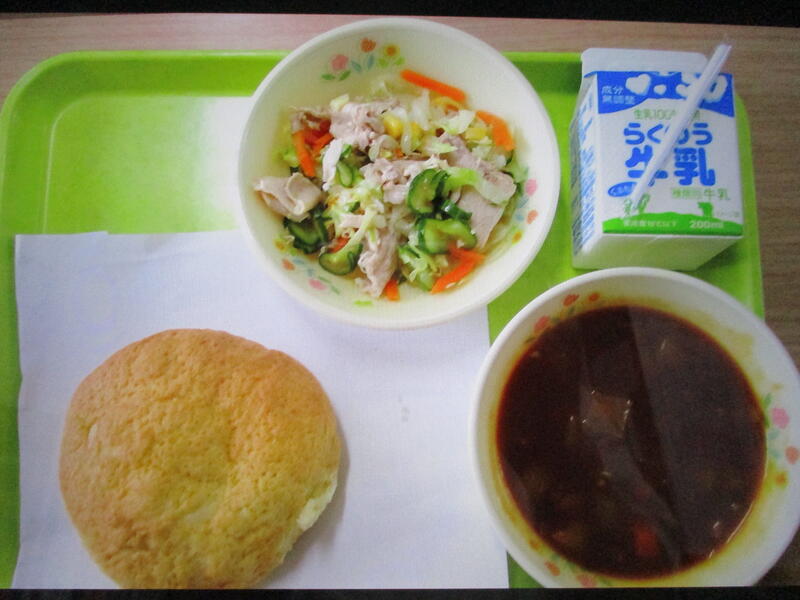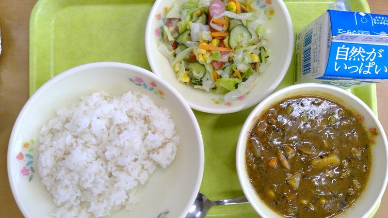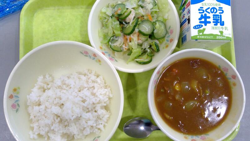 今日の献立は、ポークカレー、チキンサラダでした。1年生の子どもたちもサラダをおかわりしてくれた人がたくさんいました。