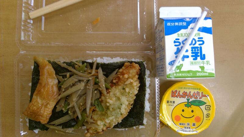今日の献立は、のり弁、ばんかんゼリー、でした。わかめごはんの上に半分に切った焼きのりを敷いて、さくさくのホキのフライとちくわの煮付け、きんぴらごぼうをトッピングしました。1年生の子どもたちもとても喜んでくれ「ピクニックみたい!」と笑顔で食べてくれました。