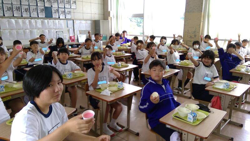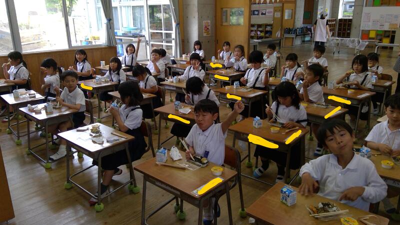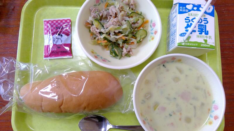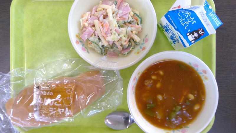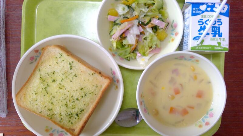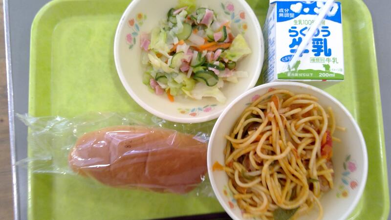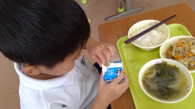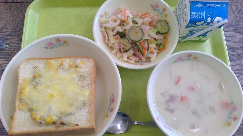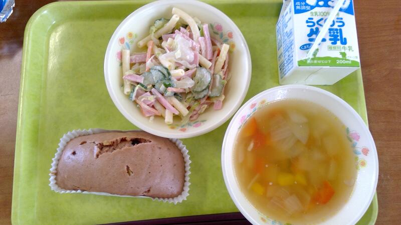 今日の献立は、コッペパン、リンゴジャム、ポークビーンズ、マカロニサラダでした。今日からプラスチックごみ削減の目的で、牛乳のストローがなくなりました。子どもたちはパックの上部をあけて、コップのようにして飲むことになります。1年生の子どもたちも全員上手にあけることができ、ゴクゴクと飲むことができました。