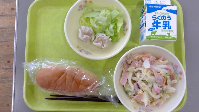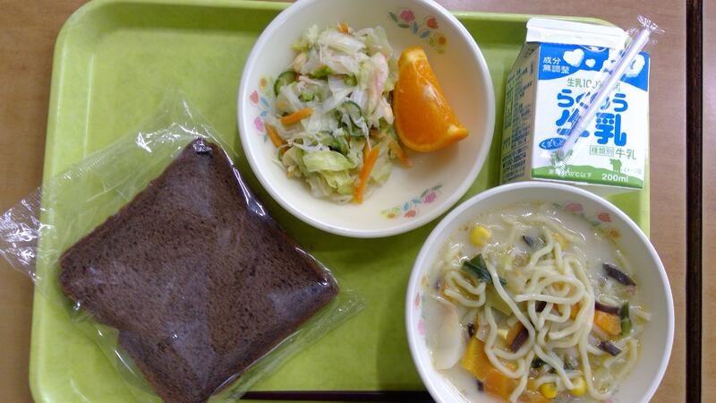 今日の献立は、食パン、ちゃんぽん、揚げぎょうざ、ドレッシング和えでした。ちゃんぽんは、時間が経つとめんがのびてしまい、大量調理の学校給食では難しいメニューの一つです。できるだけおいしく食べてもらう工夫として、冷凍のちゃんぽん麺を蒸して温めた後、冷水でしっかり洗ってぬめりを取り、時間ギリギリにスープに投入して仕上げています。