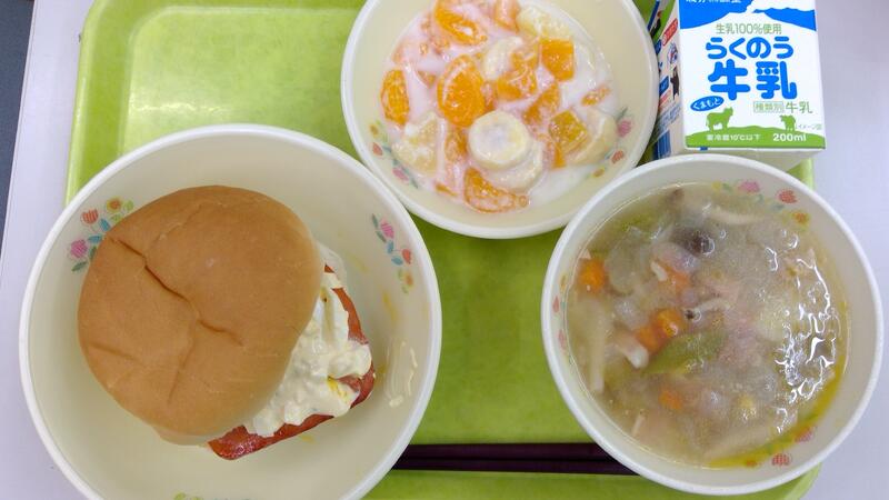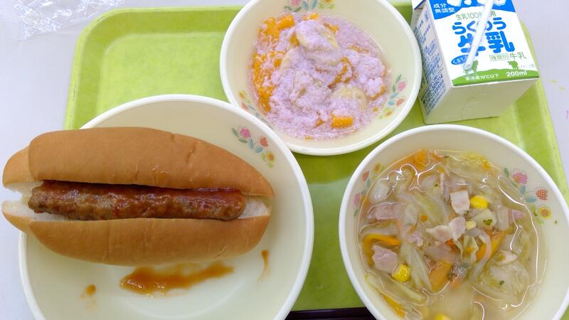 今日の献立は、スティックドッグパン、オニオンスープ、フルーチェでした。今日の給食をとても楽しみにしていた子どもたち、6年生教室でもおかわりに長蛇の列ができていました。フルーチェはフルーツと混ぜ合わせてすぐはきれいに仕上がってましたが、少し時間が経つと分離してしまい残念でした。