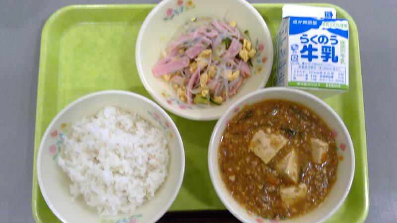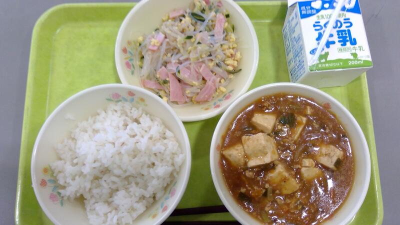 今日の献立は、麦ごはん、麻婆豆腐、バンサンスーでした。5年生のお友だちから「麻婆豆腐に使われてる豆腐はきぬ豆腐ですか。木綿豆腐ですか。」と質問を受けました。きぬ豆腐もなめらかでおいしいですが、大量調理ではくずれやすいので給食で使う豆腐はすべて木綿豆腐です。気づきが素晴らしいですね。
