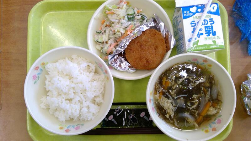 今日の献立は、麦ごはん、きくらげすり身コロッケ、コールスロー、豆腐のみそ汁でした。今日の主菜「きくらげすりみコロッケ」は姫戸小の6年生が考案したメニューです。姫戸小では昨年度から「歯と口の健康づくり」の学習に取り組んでおられ、「よくかんで食べる」をテーマに献立コンクールを開かれ、見事選ばれた作品です。この秋、市内の全小中学校で提供されます。今津っ子にもとても好評で、6年生教室では増量希望の人が多数いました。