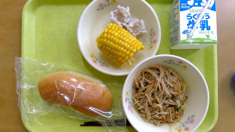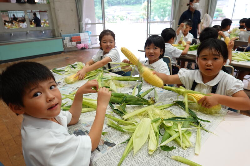 今日の献立は、ミルクパン、ソースビーフン、蒸ししゅうまい、とうもろこしでした。今日の地場産物は、今泉後山地区で作られている磯田農園様のものです。皮付きで納めていただき、1時間目に1,2年生が皮むきにチャレンジしました。甘くて身がぎっしりつまったとてもおいしいとうもろこしに子どもたちも大喜びでした。