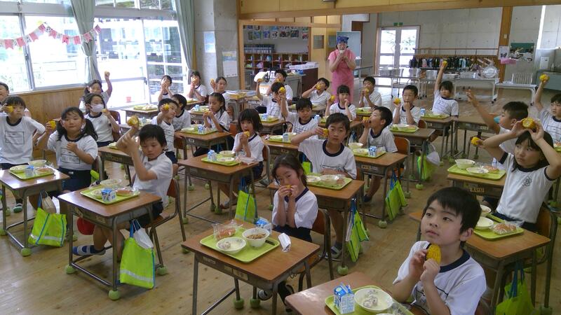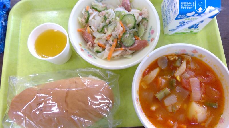 今日の献立は、コッペパン、鶏肉とジャガイモトマト煮、イタリアンサラダ、ばんかんゼリーでした。ばんかん果汁は大矢野の水野様より納入いただきました。苦みも少なくちょうどいい甘さと酸味があり、おいしいゼリーになりました。