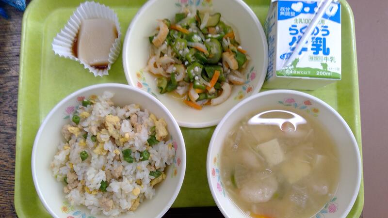 今日の献立はオムライス、レタスサラダ、コンソメスープでした。6月の初めに放送委員会の企画で1年生インタビューがあり、「好きな食べ物はなんですか?」の質問に「オムライス」と答えた人がたくさんいました。今日の給食を楽しみにしていた1年生ですが、想像していたオムライスとは異なり「ちがう」と残念がっていたお友だちも数名いたようです(^0^;)