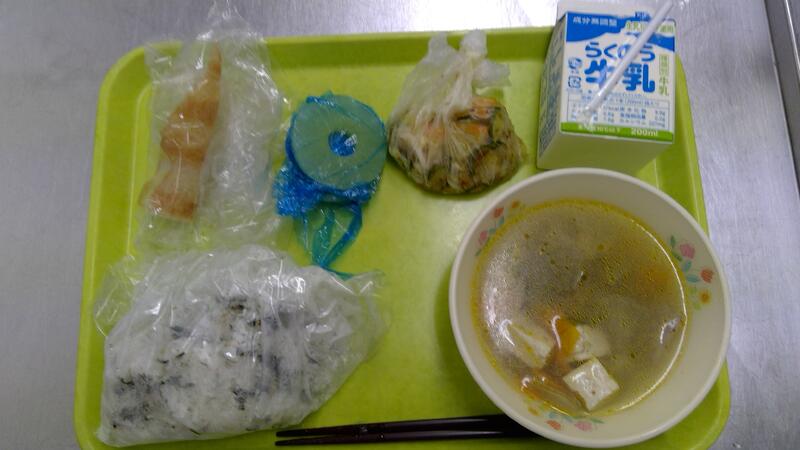 献立は、わかめごはん(セルフおにぎり)、ちくわ、かつおあえ、豚汁、パインでした。汁もの以外は使い捨て可能なビニール袋を食器代わりにして、子どもたちはビニール袋の上からごはんを上手に握って、おにぎりを作り、和え物も袋から上手にはしで取り出し食べることができました。