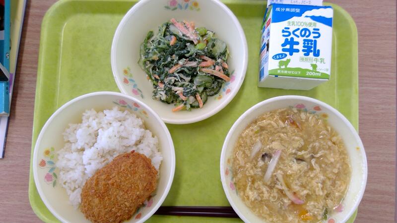 今日の献立は、麦ごはん、肉じゃがコロッケ、でこぽん酢和え、かき玉汁でした。今日から図書委員さんによる秋の読書月間の企画「絵本とコラボ給食」が始まりました。今日の絵本は、「ポテトむらのコロッケまつり」でした。図書委員さんの読み聞かせ動画を見ながらコロッケを味わって食べました。