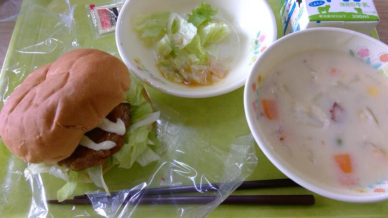 今日の献立は、てりやきバーガー、豆乳クリームシチューでした。今日のシチューは夏休み中に開催された調理講習会で習ったレシピでしたが、隠し味として仕上げに「みそ」を入れるのがポイントでした。みそを入れることで、こくのあるやさしい塩味が加わりました。