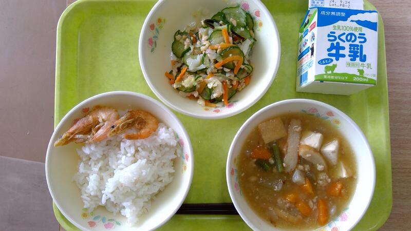今日の献立は、麦ごはん、とうがんそぼろ煮、きゅうりの納豆和えでした。今日も暑い一日となりました。体を冷ましてくれる効果のあるとうがんで元気になって欲しいと思います。今日は5年生が「生命の海プロジェクト」という環境学習に取り組みました。ゲストティーチャーでご参加いただいたニチレイフレッシュさんより天草産の芝エビを5年生にプレゼントしていただきました。素材の味が生かせるようにうすく塩こしょうした唐揚げにしておいしくいただきました。