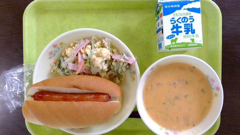 今日の献立は、ウインナーパン、にんじんクリームスープ、卵サラダでした。今週は10月10日の目の愛護デーにちなんで、目にいい食べ物を毎日取り入れています。今日のピックアップ食材は、目にいい栄養ビタミンAをたっぷり含むにんじんと卵です。にんじんはペースト状にした物をたっぷりスープに混ぜてオーロラ色のきれいなスープになりました。1年生がもりもりおかわりをしてくれました。
