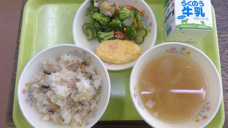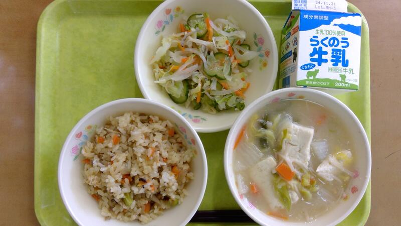 今日の献立は、鶏釜飯、ちゃんこ鍋、かみかみあえでした。今日は11月8日、118でいい歯の日です。よくかんで食べるものや歯に良いカルシウムをを含む食材をたっぷり取り入れました。各教室で、よくかんで食べることの効能を歌にした「ひみこのはがいいぜソング」を上映しました。2年生教室では「ひみこさん(邪馬台国の女王)はたくさんかんで食べてたんですか?」と質問があり、他の学年の授業で使ったスライドを見て、大昔の食事と今の子どもたちの好きな食事を比較しました。