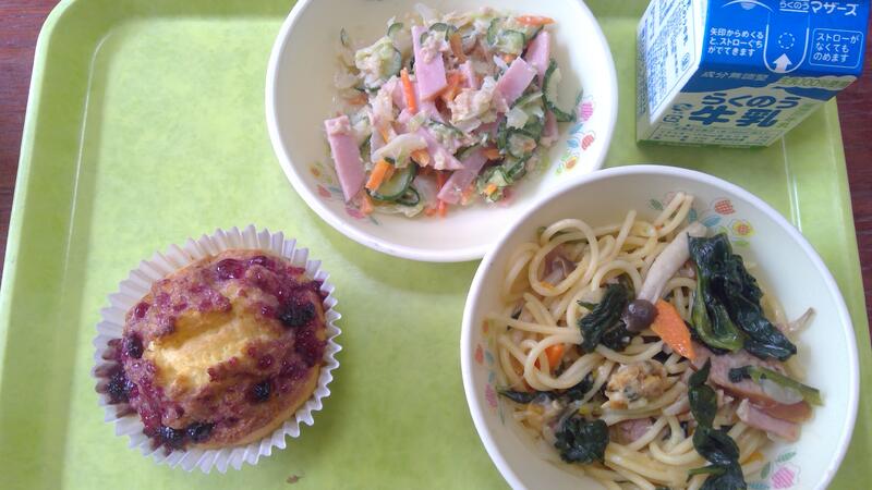 今日の献立は、ブルーベリーマフィン、ポパイスパゲティ、シーザーサラダでした。今日10月10日は目の愛護デーです。今日のピックアップ食材は、ブルーベリー、ほうれん草、にんじんです。給食時間は健康委員会作成の「目にいい食べ物クイズ」の動画を見ながら目にいい栄養について学習しました。手作りのブルーベリーマフィンは大成功。各クラス若干名「ブルーベリーが苦手です。」という今津っ子も見られましたが、「うわぁー、おいしそう!」という声がたくさん聞かれました。