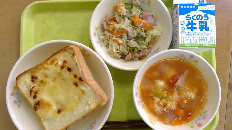 今日の献立は、クアトロフォルマッジ、ミネストローネ、イタリアンサラダでした。初登場チャレンジメニューの「クアトロフォルマッジ」本来は4種のチーズが乗ったピザにはちみつをかけて食べるものですが、今日の給食では、①クリームチーズとマーガリン、砂糖を練り合わせた物をパンに塗り、②とろけるチーズをトッピング、③はちみつをかけてオーブンで焼いて完成です。2年生の今津っ子がとても気に入ってくれて、「作り方を教えてください。」「家でも作りたいです。」という声をたくさんもらいました。おたよりで紹介させてもらいます。