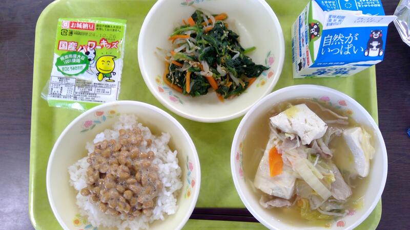 今日の献立は、高菜ご飯、せんだご汁、ごまネーズ和えでした。今月の郷土料理「せんだご汁」、今日は天草の食の名人さんが作られる様子を動画で見て学習しました。さつまいもを茹でてつぶし、400人分のだごをこねて、輪切りにするのはとても大変でしたが、3年生教室では「だごが〇個入っていましたー!」「私は〇個です。」と嬉しそうに報告し合う声が聞かれ、疲れも吹き飛びました。