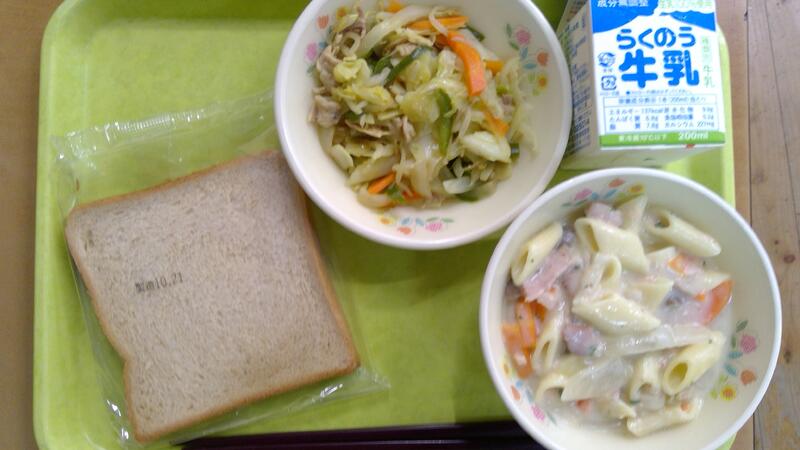 今日の献立は、黒糖パン、ペンネのクリーム煮、野菜ソテーでした。ペンネのクリーム煮のホワイトソースは給食室の手作りです。マーガリンに小麦粉をふるってよく炒め、牛乳を少しずつ入れて伸ばしていくときれいなホワイトソースが完成しました。2年生教室ではクリーム煮のおかわり希望多数でした!