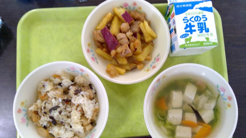 今日の献立は、山菜おこわ、いもと大豆のからめ煮、青さ汁でした。秋の味覚たっぷりのおこわは、もち米といつものお米を1:1で混ぜて、もちもちした仕上がりになりました。芋と大豆のからめ煮は、さつまいもを素揚げし、大豆と鶏肉は唐揚げにして甘辛いタレで和えました。どちらも1年生のおかわり希望多数でした。