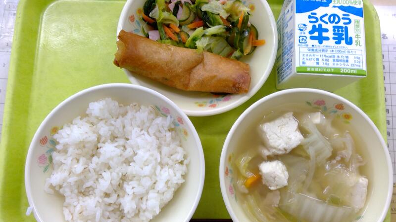 今日の献立は、麦ごはん、春巻き、中華サラダ、白菜スープでした。
